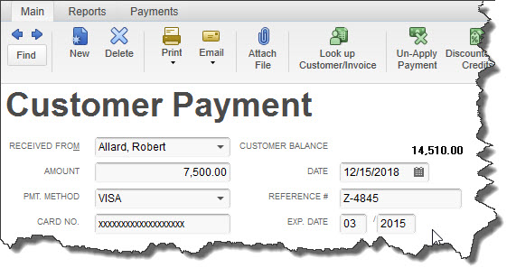 When you sign up for an Intuit Merchant Services account, you can store your customers’ credit card data in their QuickBooks records. Then when you process an incoming remittance on the Receive Payments screen, you only have to select that stored card option to record the transaction. You can even include a link on electronic invoices that lets customers enter their credit card information to pay instantly.