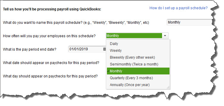 One of your early tasks will be to establish one or more payroll schedules. These simply mandate the timing of your payroll, creating an ongoing calendar of paydays. You can do this before you begin entering employee information, though you can revisit those records to specify or change an existing employee’s payroll schedule.