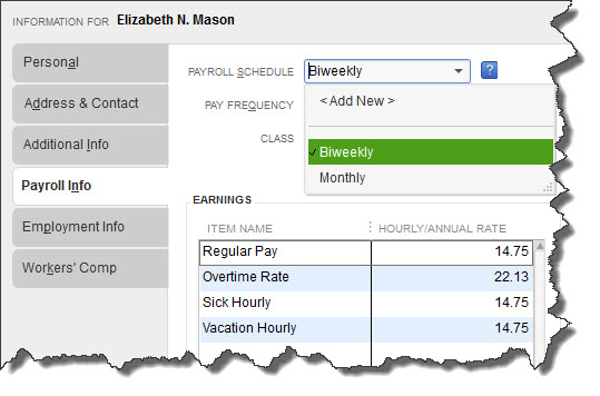 Click the down arrow next to PAYROLL SCHEDULE and select the frequency you want, or click on <Add New> to establish a new one.
