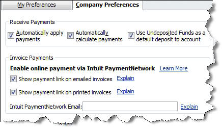 First, though, make sure that QuickBooks is set up for this service. Go to Edit | Preferences. Click on Payments, then the Company Preferences tab. Check the two boxes below Enable online payment via Intuit Payment Network and enter the email address that you want to use (only the administrator can activate these preferences).