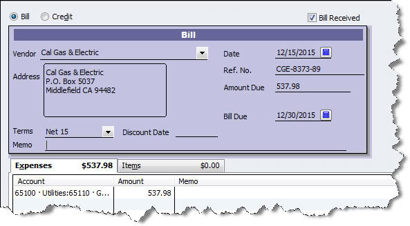 When an expense bill comes in (from a utility company, for example), click the Enter Bills icon on the home page, or Vendors | Enter Bills. A window like the one displayed above opens. Select the vendor and fill in the blanks. Make sure that the Expenses tab below is selected and the appropriate account number and amount fields are completed. If it’s a bill for an item that already has a related Item Receipt (the shipment preceded the bill), QuickBooks instructs you to use Vendor | Enter Bill for Received Items. Follow the prompts.
