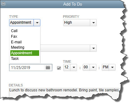You aren’t required to create this link; you can simply designate your to-do type and enter a DATE, TIME, and DETAILS. The activity will still appear on your QuickBooks calendar. But if you do associate it with a specific entity, like a customer, it will appear in that customer’s record when you click on the To Do’s tab.