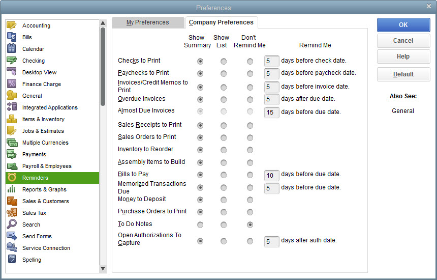 Figure 3: You can get advance notice of scheduled financial activities by setting up Reminders. Go to Edit | Preferences | Reminders | Company Preferences.