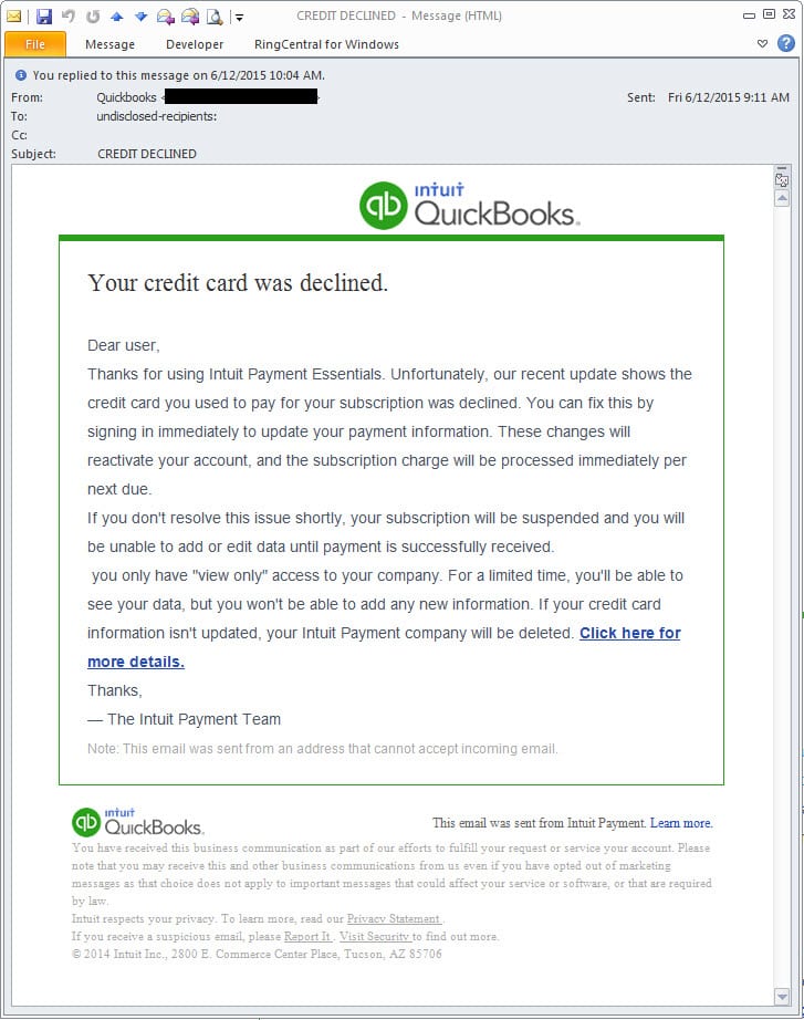 To my surprise, I received an email from Intuit about my credit card being declined while purchasing a QuickBooks Payment – Merchant Service. Really? How can this be? I entered the right numbers and dates when I ordered my products and my credit score is good. In fact I just inquired about my credit score because I was looking into taking out a loan. So, I called Intuit support and checked my online statement and it turns out that this email was spam and was not actually from Intuit. So beware of the spam emails that may find their way into your email, they may be the cause of your downfall or the perk that saves your business thousands of dollars.